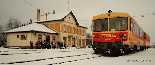 Meg persze a hír, a vonat amivel tovább utaznánk fél órát késik. Nincs mit tenni, bemegyünk a büfébe ahol a csapat nagyobbik fele várakozik. Egy reggeli kaffe ébresztőként, kinek sör kinek pálinka fagyálló folyadék gyanánt. Pár perccel 10 után megérkezik a vonat, felszállunk irány a Schaffer kút. A masinisztával lezsíroztuk legyen jó fej, és álljon meg. Így is tesz, lepattanunk és irány Drégelyvár. Felfelé meredek úton haladunk, 30cm friss hóban törve az utat.