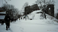 Az idő nem épp kegyes hozzánk ezen a napon. Felettünk hófelhők gomolyognak, arcunkat hideg szél csípi, a hópelyhek mint éles pengék vágnak arcunkba. Mindenki szuszog a húzós emelkedőn! Dzsekiket a hideg szél miatt nem vehetjük le. Izzadunk rendesen! Felérve a vár tövébe a szél felerősödik. Azonban a látvány magával ragadó.