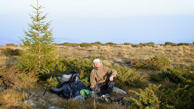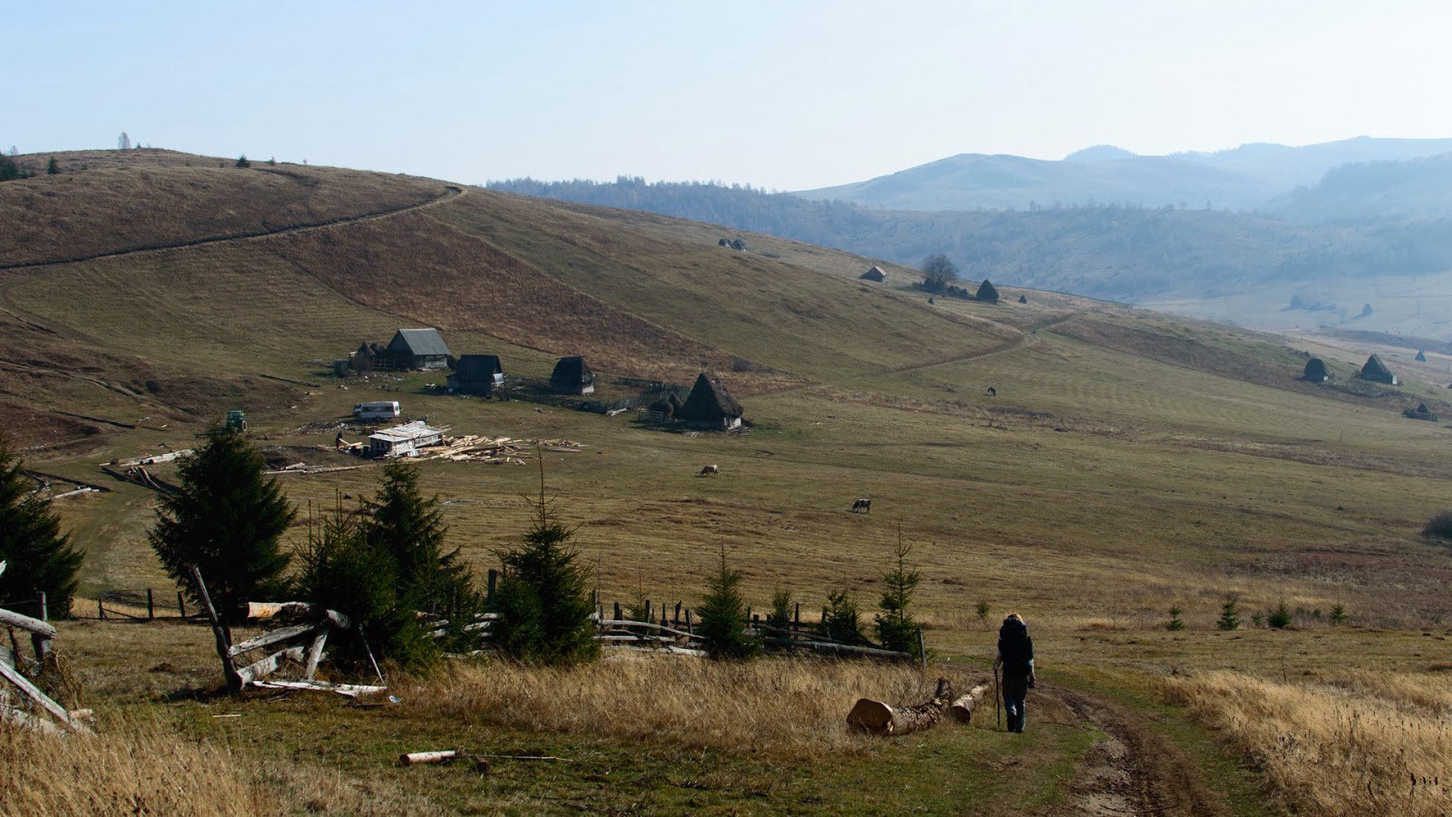 Innen a jelzés követve, egy fűrésztelepnél jobbra tartva tovább a völgyben (útbaigazítottak minket – ha a két gyönyörű kiskutya nem tereli el a figyelmünket, valószínűleg magunktól is megtaláltuk volna a helyes utat), közös megegyezés alapján újfent különváltunk, és úgy egyeztünk meg, hogy délután négykor találkozunk a kék kereszt és kék háromszög – piros kör – piros háromszög jelzések elágazásában, és majd annak közelében sátorozunk. Erre aztán úgy került sor, hogy Ákosékat annyira lekötötte az innen kínálkozó kilátás, hogy utolértük őket. Előtte még átkeltünk egy nagyon szép, hangulatos móc esztenacsoporton, hagyományos házakkal, egy-két késői nyájjal, és egy új terepjáróval. A hagyományok jól megfértek a mai kor termékeivel, egyedül a szórványosan eldobált PET palackokat nem tudom megbocsátani magamban.
