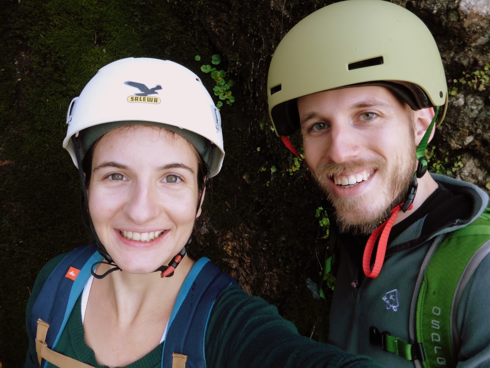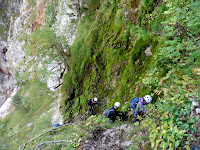 A klettersteig elejét egy vöröses, sáros talaj és jókora oldott üreg jelezte, aminek a tetejéről csöpögött a víz, hiszen egy kisebb vízesésen kellett áthaladni az első szakaszon. Szerencsénkre épp nem volt esőzés a napokban, így megúsztuk pár nyakba kapott jéghideg vízcseppel. A mögöttem hallatszó felszisszenések tudtomra adták, hogy nem csak én jártam pórul. A drótkötél pálya könnyű, de csúszós útján haladunk felfelé, majd miután elhagyjuk a kis csobogót egy vaslétrán kapaszkodunk tovább. Az út izgalmas és gyönyörű volt. Többször megálltam megcsodálni a mögöttem álló monstrum hegyeket, aminek az lett az eredménye, hogy feltorlódtak mögöttem az emberek, így sajnos ritkítanom kellett a bámészkodást.