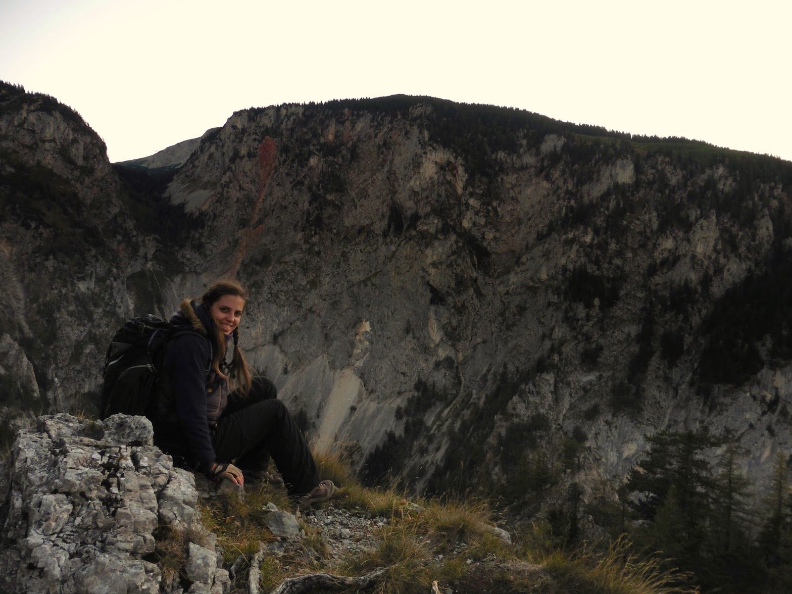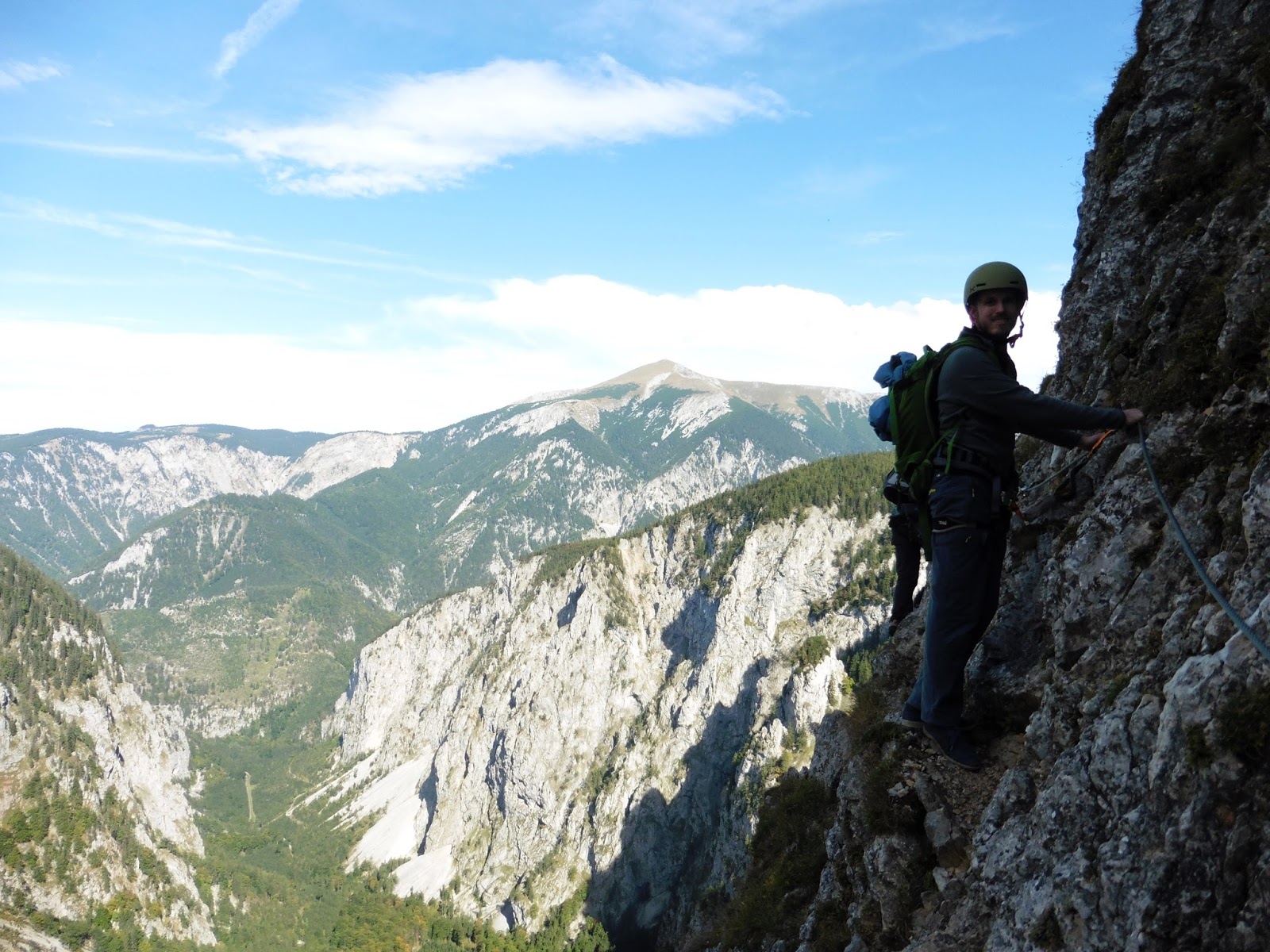 Több létra és izgalmas lépés után kiérünk egy turista útra, ahol megint kisebb kaptatón haladunk tovább a következő becsatoláshoz. Az út következő része már napos időben telt, a B nehézségű oldal mászása nem okozott gondot senkinek. Ekkor már nem nagyon voltak létrák, inkább oldalt másztunk, nem volt szükség mindenhol biztosítani magunkat, így gyorsabban haladtunk. Mikor felértünk egy magasabb pontra, volt egy kis kiugró, ahol nagyon szép közös képeket tudtunk készíteni, de persze egy kép nem adja vissza ugyan úgy a látványt, mint élőben.